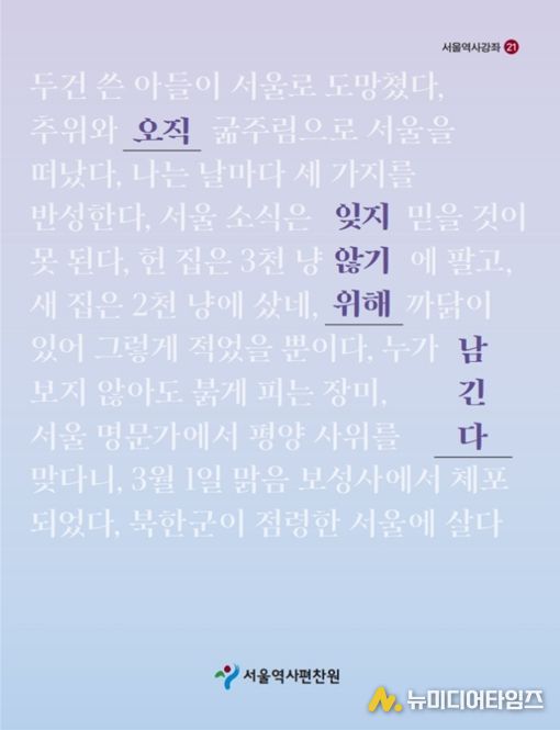 서울역사편찬원이 서울에서 살았던 개인이 남긴 기록을 통해 서울의 역사를 살펴보는 ‘서울역사강좌 제21권 《오직 잊지 않기 위해 남긴다》’를 발간했다. 시민들에게 서울의 역사를 쉽고 흥미롭게 알리는 ‘서울역사강좌’의 2026년 상반기 수업 내용을 책으로 엮은 것으로, 해당 강좌의 교재로도 활용된다.