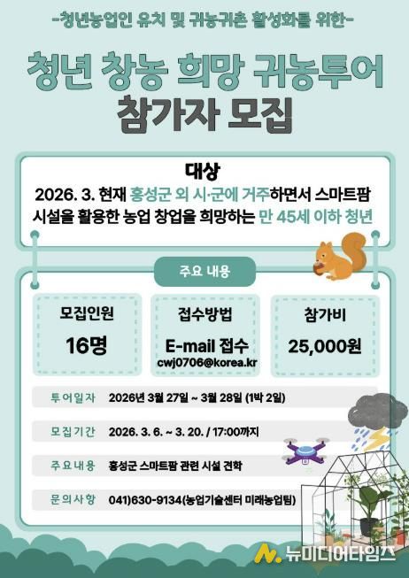 군 관계자는 “이번 프로그램은 미래 농업의 핵심인 청년들에게 홍성군의 스마트팜을 알리고, 안정적인 정착을 돕기 위해 마련했다”며, “홍성군에 우수한 농업 인재들이 모여 꿈을 펼칠 수 있도록 환경 조성에 노력하겠다”고 말했다.
