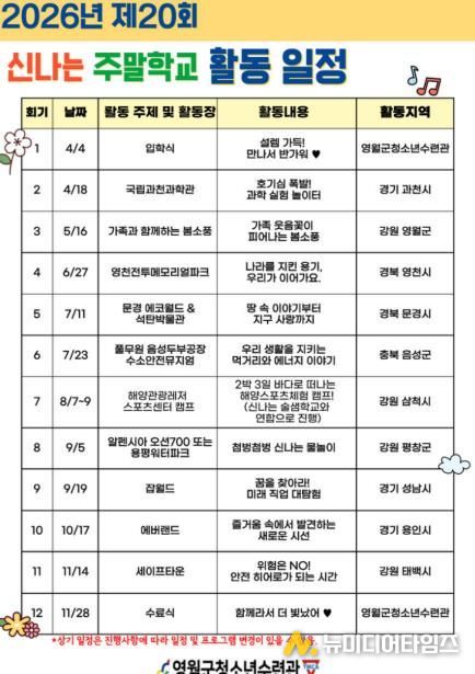 2026년 신나는 주말학교는 4월 4일 입학식을 시작으로 국립과천과학관 견학, 봄소풍, 영천전투메모리얼파크 방문, 해양스포츠 체험 캠프, 에버랜드 체험 등 총 12회에 걸쳐 운영될 예정이다.