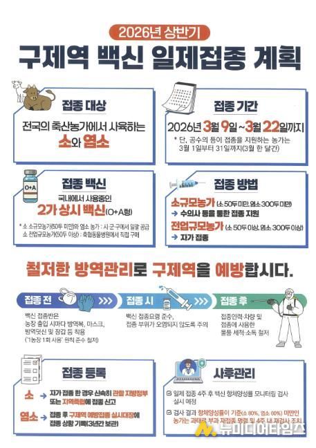 홍천군은 구제역 유입 방지와 완전 차단을 위해 상반기 구제역 일제 백신접종을 실시한다. 대상은 1,001 농가 36,830두(소 928 농가 33,566두, 염소 73 농가 3,264두) 사육 농가이다.