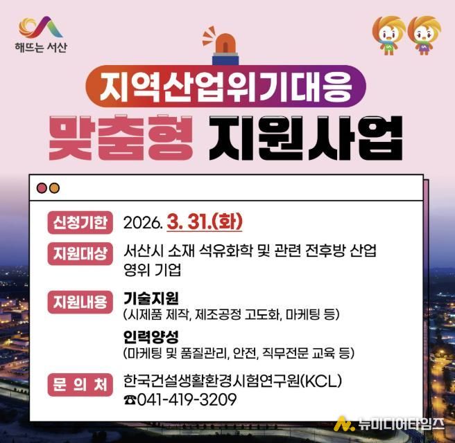 충남 서산시가 석유화학 산업의 위기 극복과 지역경제 활성화를 위해 ‘2026년 지역산업위기 대응 맞춤형 지원사업’을 본격 추진한다고 밝혔다.