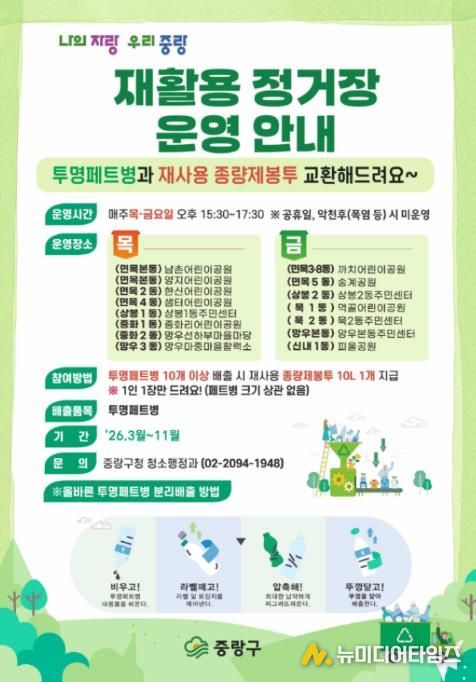 류경기 중랑구청장은 “재활용 정거장을 통해 분리배출에 대한 주민 인식을 높이고, 자원순환이 일상 속 실천으로 정착될 수 있도록 운영을 내실화하겠다”고 말했다.
