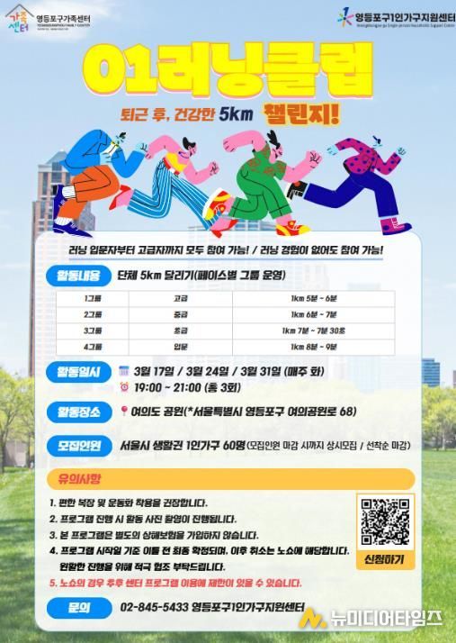 영등포구가 서울시 생활권 1인 가구의 건강 증진과 사회적 관계망 형성을 위해 ‘01러닝클럽’ 참여자를 모집한다고 밝혔다.
