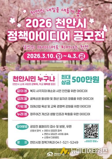 천안시가 시민의 창의적인 아이디어를 시정에 반영하고 정책 참여 문화를 확산하기 위해 ‘2026 천안시 정책 아이디어 공모전’을 개최한다.