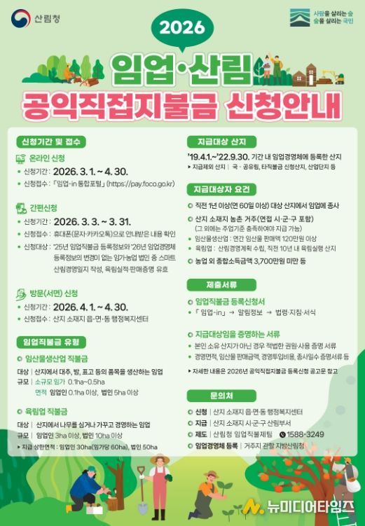 신청은 오는 4월 30일까지 ‘임업-in 통합포털또는 산지 소재지 읍면 행정복지센터에 방문해 신청할 수 있다.