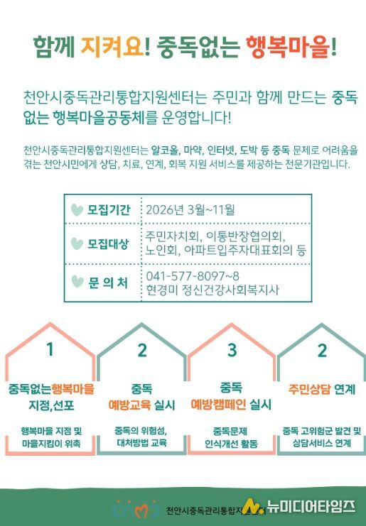 천안시중독관리통합지원센터는 올해 ‘함께 지켜요! 중독없는 행복마을’ 사업을 확대 추진한다고 11일 밝혔다.