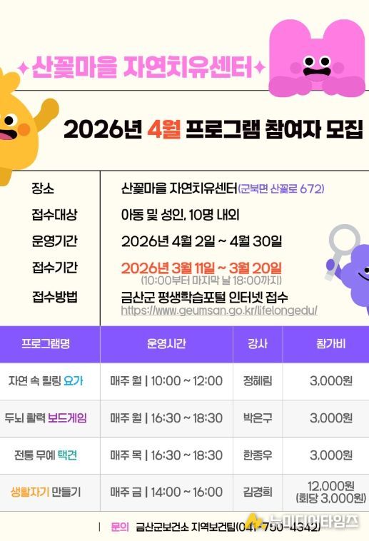 금산군은 지역 주민의 건강 증진과 여가 활성화를 위해 3월 11일부터 20일까지 산꽃마을 자연치유센터 2026년 4월 프로그램 참여자를 프로그램별로 8명에서 12명까지 모집한다.