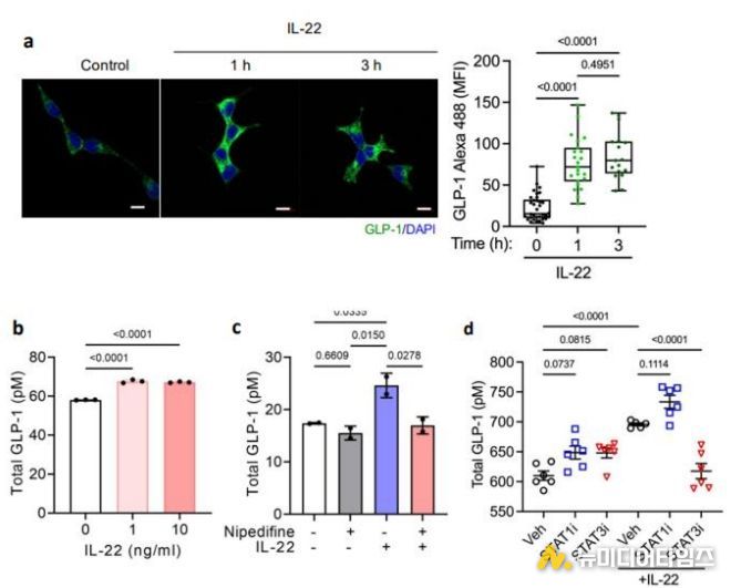 특히 IL-22 투여로 혈당이 개선되더라도 GLP-1 수용체(GLP-1R)를 차단하면 효과가 사라지는 것을 확인, IL-22의 대사개선 효능이 GLP-1 경로에 전적으로 의존한다는 사실을 기능적으로 입증했다. 이는 GLP-1을 중심으로 한 대사 항상성 조절에서 면역신호가 GLP-1 생성(발현) 단계까지 직접 관여함을 보여주는 결과다.