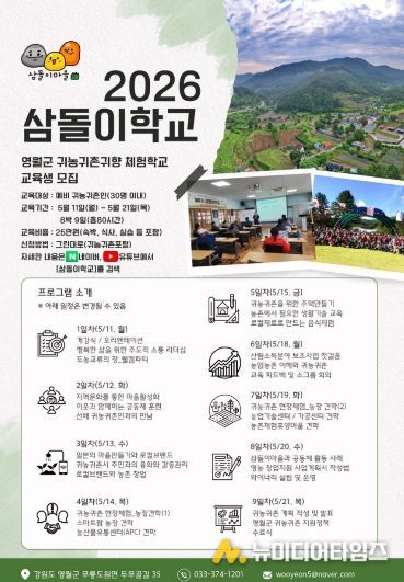 영월군은 예비 귀농·귀촌인의 안정적인 농촌 정착을 돕기 위해 '2026년 영월군 귀농·귀촌 체험학교' 교육생을 모집한다.