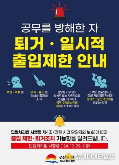 김천시가 공무수행을 방해하는 악성 민원인에 대한 출입제한 및 퇴거조치를 본격 시행하는 등 민원 환경 개선에 나섰다.