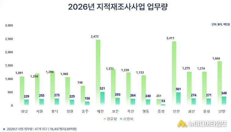 올해 충북도는 47개 지구 1만8,497필지를 대상으로 총 39억 원을 투입해 지적재조사사업을 추진하고 있으며, 토지 경계 정비와 디지털 지적 구축을 통해 토지 이용 효율성을 높이고 도민 재산권 보호에 기여할 것으로 기대된다.