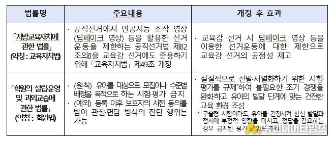 교육부는 이번 법률 개정을 통해, 공직선거에서 인공지능 조작 영상(딥페이크 영상) 등을 활용한 선거운동을 제한하는 '공직선거법' 제82조의8을 교육감 선거에도 준용하여 교육감 선거의 공정성을 높이고자 했다.