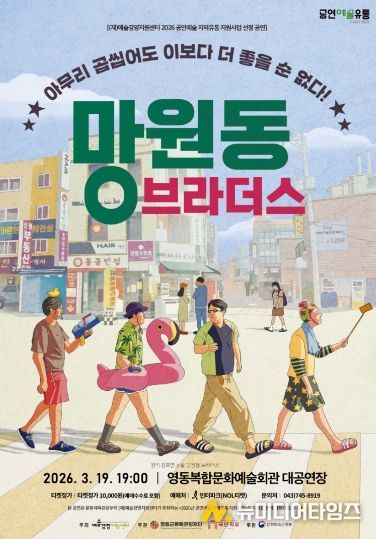 (재)영동군문화관광재단은 2026년 공연예술 지역유통사업 선정작인 연극 ‘New 망원동 브라더스’를 오는 19일 오후 7시 영동복합문화예술회관에서 선보인다고 밝혔다.
