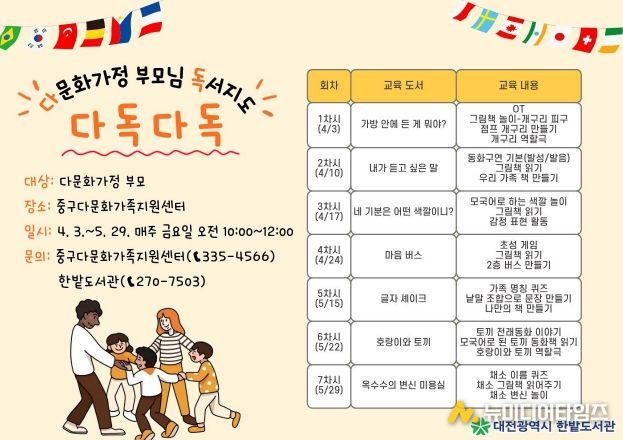 한밭도서관은 4월 3일부터 5월 29일까지 매주 금요일 중구다문화가족지원센터에서 독서지도 교육 프로그램 ‘다독다독’을 운영한다.