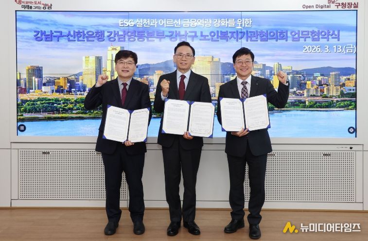 꿈이 모이는 도시, 미래를 그리는 강남구가 13일 구청에서 ㈜신한은행 강남영동본부, 강남구 노인복지기관협의회와 3자 업무협약을 체결하고 어르신 금융역량 강화 교육을 추진한다. 이번 협약은 디지털 금융환경 변화에 따른 어르신들의 금융 소외를 예방하고, 보이스피싱 등 금융사고로부터 안전한 일상을 지원하기 위해 마련됐다.