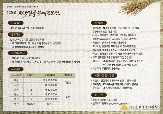 양구선사·근현대사박물관이 우리 민족 고유 미풍양속을 계승하고 짚풀공예의 예술적 가치를 조명하기 위해 2026년 함춘문화예술제 전국짚풀공예공모전을 개최한다.