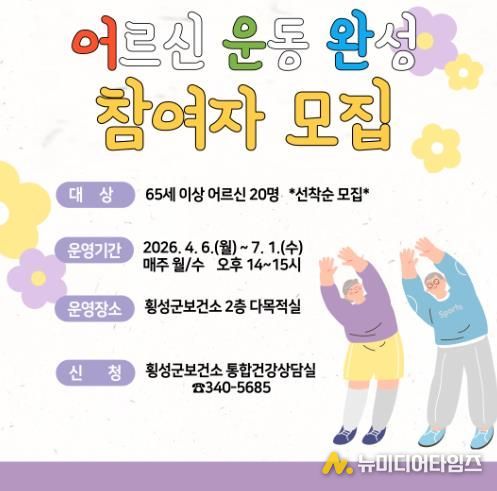 횡성군은 오는 16일부터 10일간 65세 이상 주민을 대상으로 ‘어르신 운동 완성’ 프로그램 참여자 20명을 선착순 모집한다고 밝혔다.