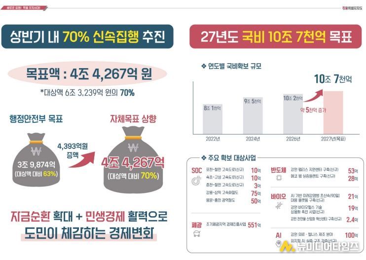 강원특별자치도는 민생경제 활력을 위해 상반기 내 신속집행 대상 예산액의 70%인 4조 4,267억 원을 집행하고 2027년도 국비는 10조 7,000억 원 확보를 함께 추진해 나갈 계획을 밝혔다.