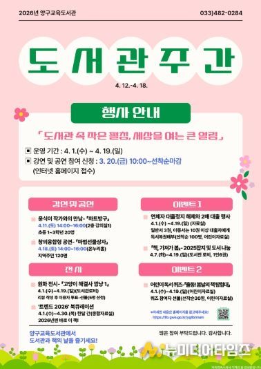 양구교육도서관(관장 김훈)은 4월 12일부터 18일까지의 도서관 주간을 맞아 지역 주민과 학생들이 함께 참여할 수 있는 다양한 독서·문화 행사를 운영한다.