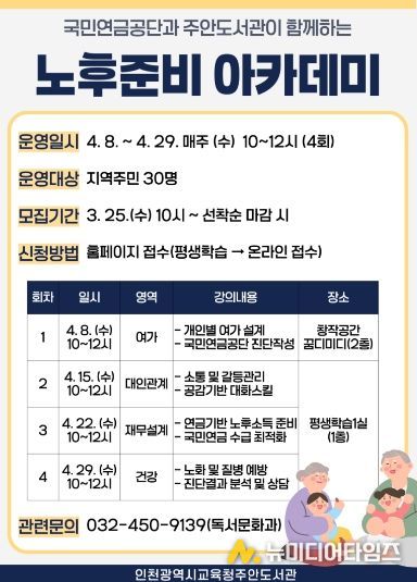 인천광역시교육청주안도서관은 시민들의 체계적인 노후 설계를 지원하기 위해 '노후준비 아카데미' 참여자를 모집한다.