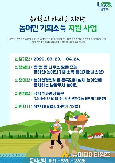 남양주시는 오는 23일부터 ‘2026년 농어민 기회소득 지원사업’을 신청받는다고 18일 밝혔다.