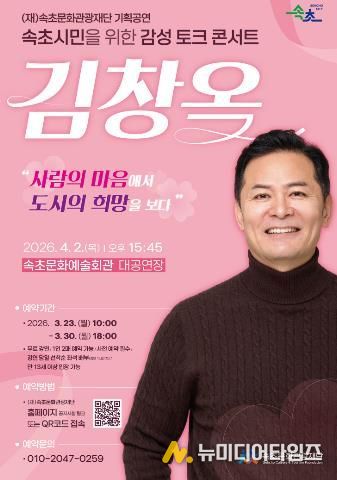 (재)속초문화관광재단은 오는 4월 2일 오후 3시 45분 속초문화예술회관 대공연장에서 기획공연 속초시민을 위한 감성 토크콘서트 김창옥 초청 강연을 개최한다.
