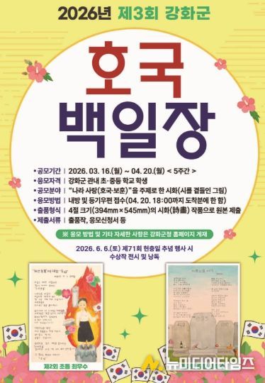 강화군은 오는 4월 20일까지 관내 초·중학교 학생들을 대상으로 ‘2026년 제3회 강화군 호국 백일장 공모전’을 개최한다고 밝혔다.