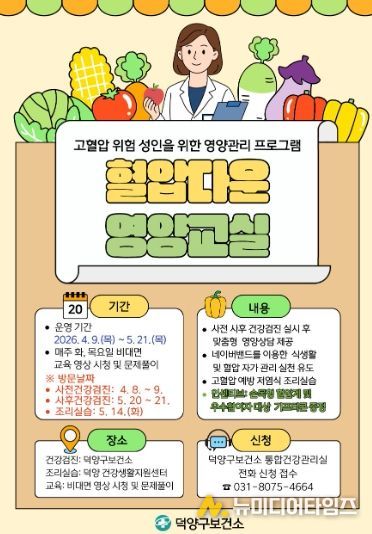 고양특례시 덕양구보건소는 고혈압 예방을 위한 영양교육과 시민의 건강한 식생활 실천 유도를 위해 ‘혈압다운 영양교실’1기 참여자 20명을 모집한다.