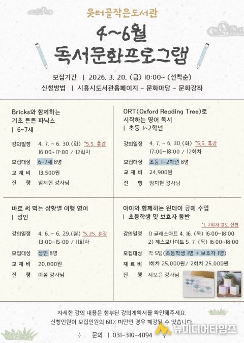 시흥시 은행동에 있는 웃터골작은도서관은 오는 4월 6일부터 6월 30일까지 약 3개월간 상반기 독서문화프로그램을 운영한다.