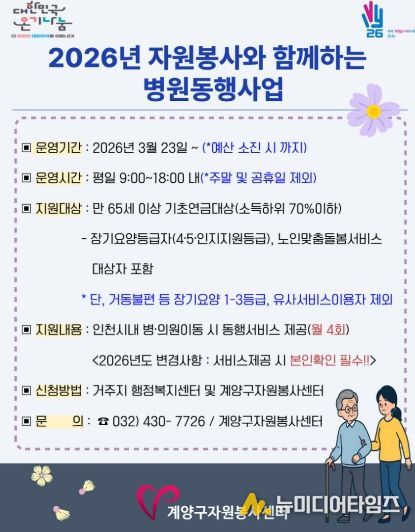 인천 계양구자원봉사센터는 3월 23일부터 ‘2026년 자원봉사와 함께하는 병원동행사업’을 실시한다고 밝혔다.