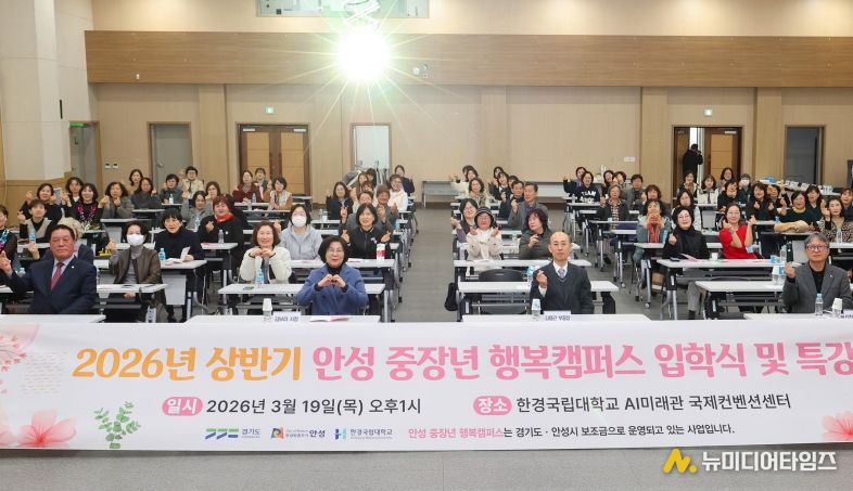 안성시는 3월 19일 오후 1시 한경국립대학교 미래융합기술연구센터 국제컨벤션센터에서 “2026년 안성 중장년 행복캠퍼스 상반기 정규과정 입학식을 성황리에 개최했다.