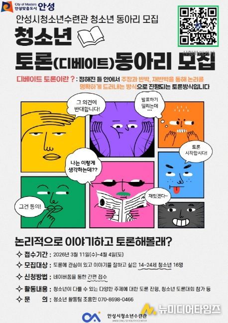 안성시청소년수련관 관계자는 “청소년들이 토론을 통해 자신의 생각을 논리적으로 표현하고, 타인의 의견을 경청하며 존중하는 민주시민으로 성장할 수 있도록 적극 지원하겠다”고 전했다.