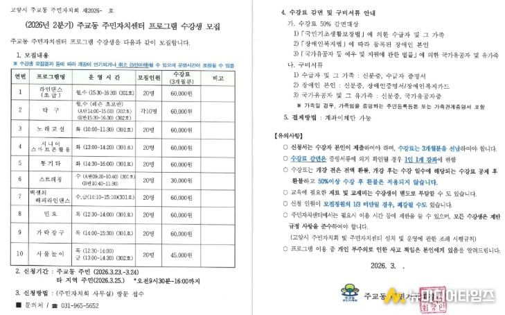 고양특례시 주교동 주민자치회는 오는 3월 23일부터 25일까지, 2분기 주민자치센터 문화강좌 프로그램 수강생을 모집한다.