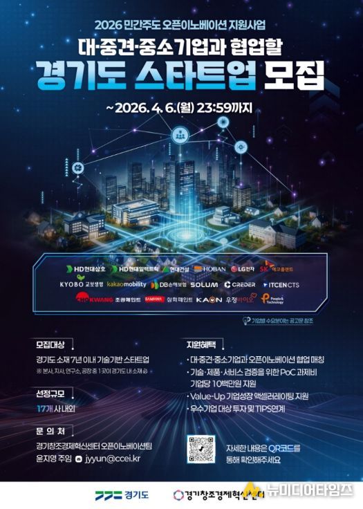경기도와 (재)경기창조경제혁신센터(이하 경기창경센터)는 도내 유망 스타트업의 혁신 성장을 돕고 대·중견기업과의 상생 협력을 도모하기 위해 ‘2026년 민간주도 오픈이노베이션 지원 사업’에 참여할 스타트업을 모집한다.