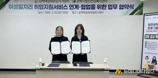 삼척여성새로일하기센터와 삼척시정신건강복지센터는 2026년 3월 20일, 지역 여성과 청년의 정신건강 증진 및 안정적인 사회 참여 지원을 위해 업무협약(MOU)을 체결했다.