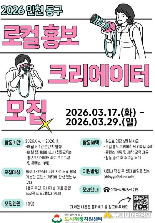 인천동구도시재생지원센터는 오는 29일까지‘2026 인천 동구 로컬 홍보 크리에이터’를 공개 모집한다고 밝혔다.