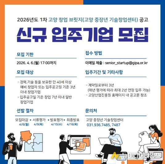 고양산업진흥원이 운영하는‘고양 창업 브릿지(고양중장년기술창업센터)’가 오는 4월 6일까지 신규 입주할 예비창업자와 창업기업을 모집한다.