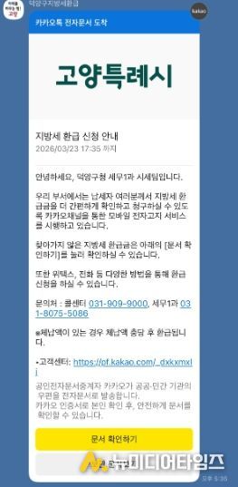 고양특례시 덕양구는 23일 오늘 지방세 환급금을 수령하지 않은 납세자를 대상으로 카카오 알림톡(채널명: 덕양구지방세환급)을 발송해 환급금 조회 및 신청 방법을 안내할 예정이다.