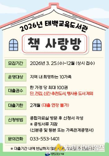 태백교육도서관은 3월 25일부터 12월까지 지역 내 희망하는 10가족을 대상으로 생활 속 독서문화 확산과 가정 내 독서 환경 조성을 위해 ‘책 사랑방’을 운영한다.