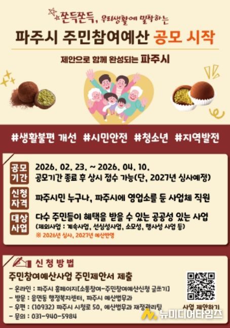 파주시는 2027년도 예산 편성에 반영할 주민참여예산 시민 제안을 오는 4월 10일까지 접수한다.