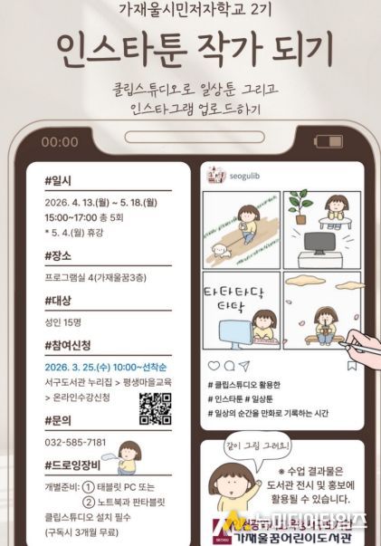 인천광역시교육청서구도서관은 지역 주민의 창작 활동을 지원하기 위해, 25일부터 가재울 시민저자학교 2기 프로그램인 ‘인스타툰 작가되기’ 참여자를 모집한다.