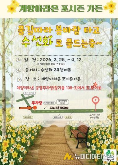 인천광역시 계양구는 봄을 맞아 계양아라온 일대에 대규모 꽃 식재를 완료하고, 포시즌가든을 중심으로 수선화가 개화하기 시작하며 화사한 봄 경관을 선보이고 있다고 밝혔다.