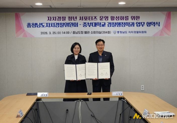 충남도 자치경찰위원회는 25일 도청 별관 소회의실에서 중부대 경찰행정학과와 ‘자치경찰 청년 서포터즈 운영 활성화를 위한 업무협약’을 체결했다.