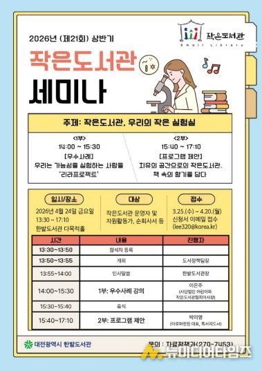 한밭도서관은 오는 4월 24일 오후 1시 30분 한밭도서관 지하 1층 다목적홀에서 대전지역 작은도서관 운영자와 자원활동가 등을 대상으로‘2026년 상반기 작은도서관 세미나’를 개최한다.