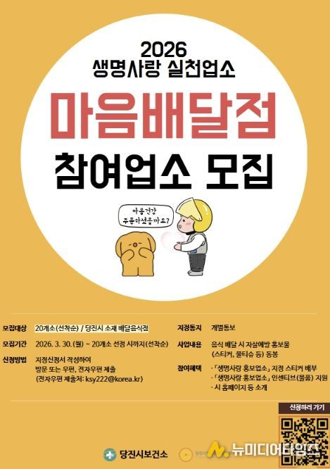 당진시는 지역사회 내 자살 예방 안전망 구축과 1인 가구의 정신건강 위기 극복을 위해 오는 30일부터 2026년 ‘마음배달점’ 신규 참여 업소를 모집한다고 27일 밝혔다.