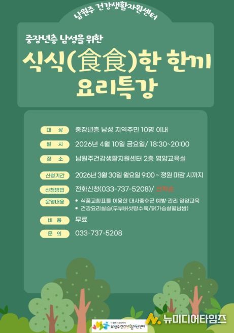 남원주건강생활지원센터는 영양 교육 및 건강 요리 실습 기회가 적은 중장년 남성을 위한 ‘식식(食食)한 한끼’ 프로그램 참여자를 모집한다.