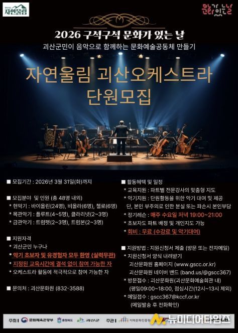 충북 괴산문화원은 문화체육관광부와 충청북도, 괴산군이 후원하는 2026년 ‘구석구석 문화가 있는 날’ 사업과 연계해 ‘자연울림 괴산오케스트라’를 창단하고 함께할 단원을 모집한다고 27일 밝혔다.