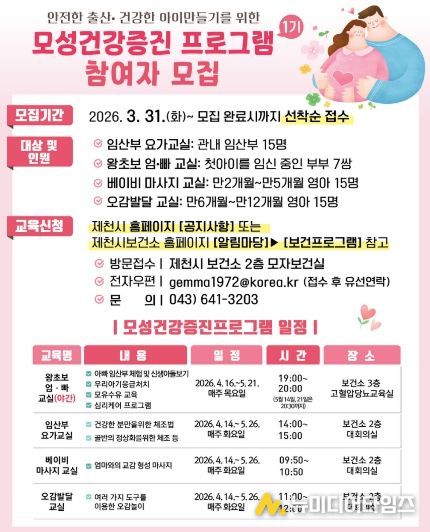 제천시 보건소는 오는 4월 중순부터 운영하는 ‘모성건강증진 프로그램’ 1기 참여자를 31일부터 선착순으로 모집한다.