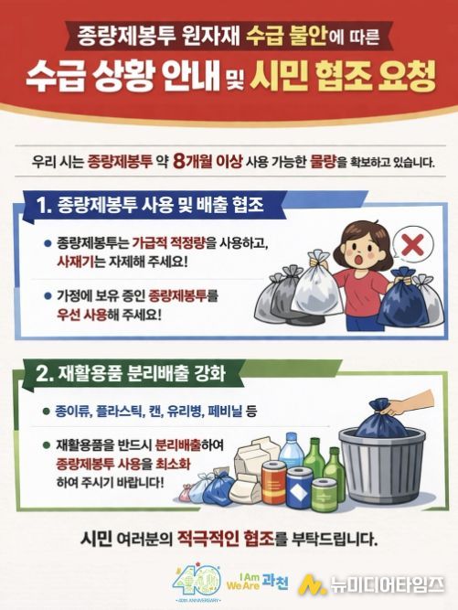 종량제봉투는 석유화학 원료인 나프타를 기반으로 한 폴리에틸렌 제품으로, 최근 중동 정세로 인해 원자재 수급 차질 우려가 제기된 품목 중 하나다. 과천시는 재고 부족으로 인한 시민 불편이 발생하지 않도록 수급 상황을 지속적으로 점검하고, 안정적인 공급 체계 유지에 행정 역량을 집중할 방침이다.