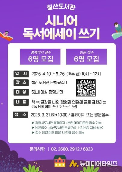 광명시 철산도서관이 신중년 대상 ‘시니어 독서에세이 쓰기’ 프로그램 수강생을 오는 31일부터 모집한다.
